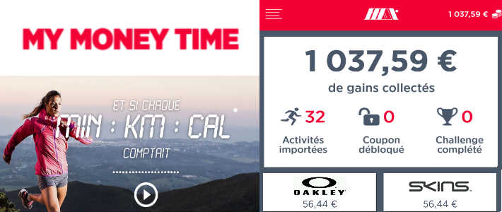 - 3- My Money Time importe les dernières activités sportives et les transforment en euros. Il s'agit d'un argent virtuel (des points) qui ensuite peuvent être échangés contre des récompenses, avantages.